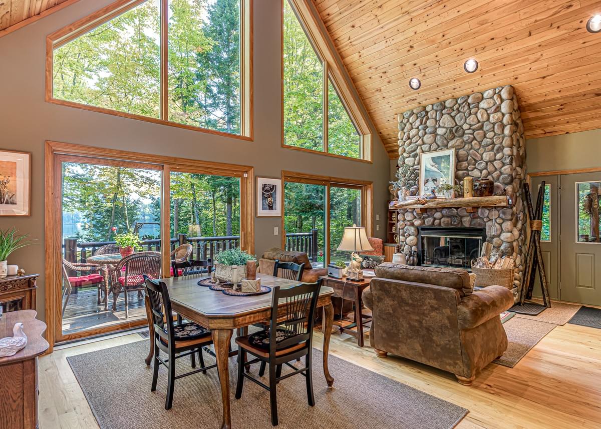 featuring cathedral ceilings, a striking stone fireplace, a full bath, and a 3-season sunroom that